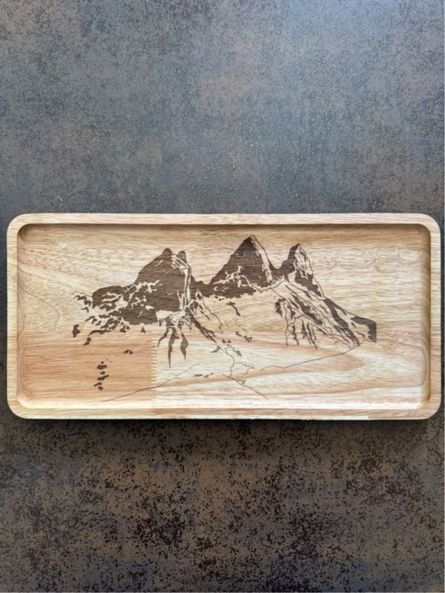 Plateau en bambou long gravé avec les Aiguilles d'Arves stylisées.