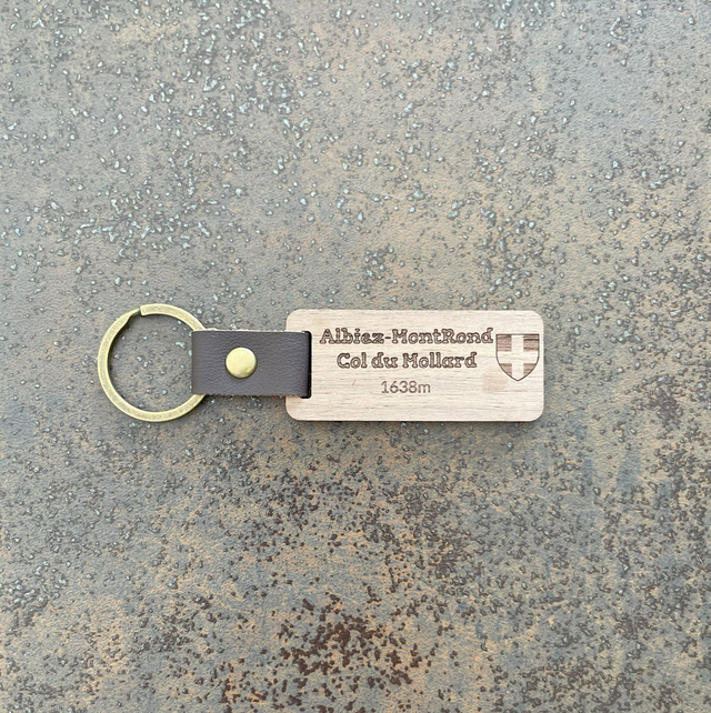 Porte clé en bois gravé "Albiez Montrond" ; "Col du Mollard" "1638m" avec le drapeau de la Savoie.
